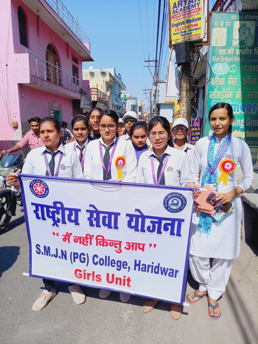 हरिद्वार 18 मार्च,संजीव मेहता।एस. एम. जे. एन.(पी.जी.) कॉलेज की राष्ट्रीय सेवा योजना छात्रा इकाई द्वारा विशेष शिविर के तीसरे दिन शिविर परियोजना क्षेत्र सीतापुर ज्वालापुर में पर्यावरण जागरूकता एवं प्रकृति संरक्षण विषय पर रैली तथा भ्रमण कार्य किया गया। जिसमें छात्राओं ने पर्यावरण जागरूकता पर नारे लगाकर सीतापुर क्षेत्र की लोगों को जागरूक किया इस प्रथम सत्र में परियोजना क्षेत्र में सेविकाओं ने सीतापुर क्षेत्र का सामाजिक, सांस्कृतिक सर्वेक्षण भी किया। जिसके अंतर्गत स्वयं सेविकाओं ने सीतापुर क्षेत्र वासियों की स्वास्थ्य समस्या, शैक्षणिक पृष्ठभूमि, आर्थिक स्थिति, रोजगारपरकता एवं विभिन्न सरकारी योजनाओं के प्रति जागरूकता के तथ्यों को एकत्रित का प्रयास किया, रैली का शुभारंभ प्रोफेसर सुनील कुमार बत्रा, डॉ संजय महेश्वरी, प्रोफेसर जगदीश चंद्र आर्य कार्यक्रम अधिकारी डॉ. सुषमा नयाल, वंदना सिंह कुमारी शाहीन द्वारा किया गया।सायं कालीन बौद्धिक क्षेत्र में उत्तराखंड सामान्य ज्ञान पर एक प्रश्नोत्तरी प्रतियोगिता का आयोजन किया गया, इसमें राष्ट्रीय सेवा योजना के “बी” प्रमाण पत्र एवं उत्तराखंड से संबंधित प्रश्नों को शामिल किया गया जिसमें निर्णायक मंडल के रूप में डॉ. आशा शर्मा ने अपना योगदान दिया, इस प्रतियोगिता में प्रथम स्थान कुमारी प्रीति बी.ए. चतुर्थ सेमेस्टर, द्वितीय स्थान खुशबू भारद्वाज बीए द्वितीय सेमेस्टर तथा तृतीय स्थान पायल मौर्य बीकॉम द्वितीय सेमेस्टर ने प्राप्त किया, शिविर में दीपांशी वेदी, ममता रावत, सलोनी, प्रीति, निधि, कशिश, खुशी, मुस्कान, शालिनी, निशि, खुशबू भारद्वाज, डाली, चंचल, आदि स्वयं सेविकाएं उपस्थित रहीं। Post Views: 617 Post navigation जिला निर्वाचन अधिकारी एवम रिटर्निंग ऑफिसर ने की राजनैतिक दलों के प्रतिनिधियों के साथ बैठक त्रिवेंद्र सिंह रावत हरिद्वार सीट पर 23 मार्च को ऑनलाइन नामांकन करेंगे