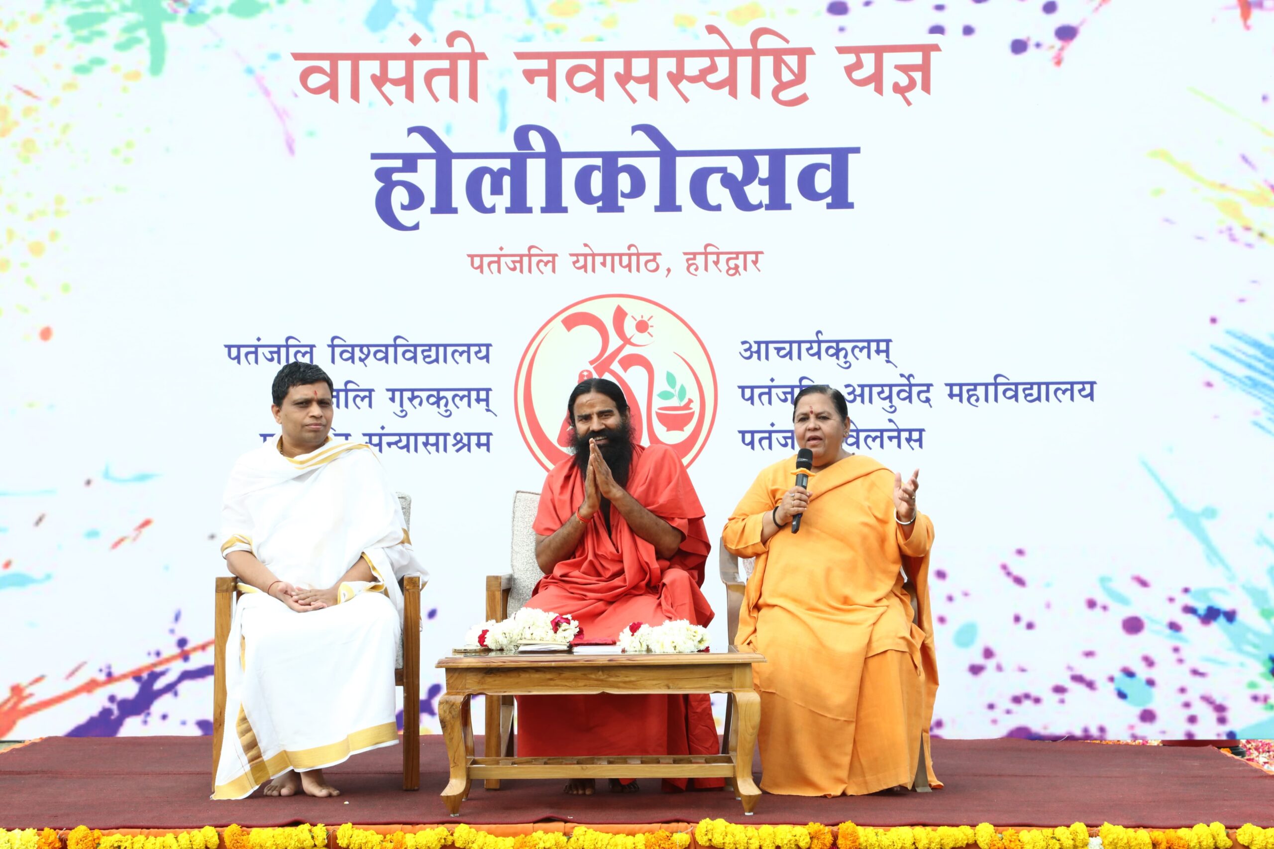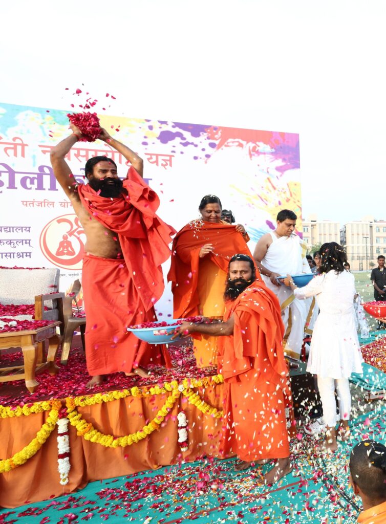 हरिद्वार,संजीव मेहता।पतंजलि योगपीठ में वासंती नवसस्येष्ठी यज्ञ के साथ मनाया गया होलीकोत्सव,इस अवसर पर पूर्व मुख्यमंत्री उमा भारती योग गुरु बाबा रामदेव जी ,अचार्य बालकृष्ण महाराज विशेष तौर पर उपस्थित रहे। इस अवसर पर स्वामी रामदेव जी महाराज ने कहा कि पहले कहां करते थे की राम आएंगे, अब तो राम आ ही गए हैं, राम राज्य भी आ जाएगा। कार्यक्रम में उमा भारती ने कहा कि कहा कि हिंदू धर्म में धर्म में मान्यता है की नारायण नर के रूप में अवतार लेते हैं लेकिन स्वामी रामदेव जी महाराज ने नर से नारायण बनने का आदर्श प्रस्तुत किया है। कार्यक्रम में आचार्य बालकृष्ण जी महाराज ने पतंजलि परिवार के साथ-साथ समस्त देशवासियों को होली की शुभकामनाएं देते हुए यह संदेश दिया कि होली का त्यौहार प्रेम, एकता और आपसी सौहार्द का पर्व है। इसे व्यसन मुक्त रहते हुए प्रेमपूर्वक मनाएं। केमिकल युक्त रसायनों का प्रयोग ना करें, प्राकृतिक रंगों से होली को सार्थक बनाएं। इस अवसर पर पतंजलि योगपीठ से संबद्ध सभी इकाइयों के इकाई प्रमुख, अधिकारी, कर्मचारी, सन्यासी भाई व साध्वी बहनें, सभी शिक्षण संस्थानों के छात्र छात्राएं उपस्थित रहे। Post Views: 1,021 Post navigation ब्रेकिंग न्यूज़।कुल 382 पव्वे देशी शराब, 26 बोतल अंग्रेजी, 12 बोतल वीयर के साथ 11 आरोपी दबोचे दो कथित पत्रकारो को चढ़ा होली का खुमार,महिला से भी की थी छेड़छाड़.अब रणविजय सलाखों के पीछे