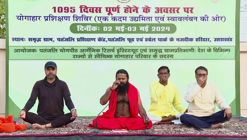 समृद्ध ग्राम पतंजलि ट्रेनिंग सेंटर में आयोजित दो दिवसीय योगाहार प्रशिक्षण शिविर देश में ऋषि कार्य एवं कृषि कार्य ही प्रगति का आधार: आचार्य बालकृष्ण हरिद्वार, संजीव मेहता।पतंजलि योगपीठ तथा पतंजलि आर्गेनिक रिसर्च इंस्टिट्यूट हरिद्वार के संयुक्त तत्वाधान में ‘योगहार: एक स्वैछिक कार्यक्रम’ के 1095 दिवस (3 वर्ष) पूर्ण होने पर आयोजित दो दिवसीय योगहार प्रशिक्षण शिविर (एक कदम उद्यमिता एवं स्वावलम्बन की ओर) आयोजित किया गया। समृद्ध ग्राम पतंजलि ट्रेनिंग सेंटर द्वारा आयोजित इस कार्यक्रम में 8 राज्यों के 200 से ज्यादा प्रतिभागियों ने भाग लिया। इस कार्यक्रम में पतंजलि द्वारा किसानो एवं ग्रामोत्थान के लिए किये जा रहे कार्यो के साथ साथ धरती का डॉक्टर मृदा परीक्षण मशीन, B-POS मशीन, जैविक कृषि, प्राकृतिक कृषि, हरित क्रांति एवं अन्नदाता ऐप की जानकारी भी दी गयी। इस कार्यक्रम में पतंजलि विश्वविद्यालय के छात्र छात्राओ ने मृदा स्वास्थय पर एक सुन्दर नाटिका भी प्रस्तुत की इस मौके पर पतंजलि संसथान के सह-संस्थापक श्री आचार्य बालकृष्ण जी ने सभी प्रशिक्षु भाई बहनो को सम्बोधित करते हुए पारंपरिक जैविक एवं प्राकृतिक कृषि को आगे बढ़ाने पर ज़ोर दिया। उन्होंने बताया कि देश में ऋषि कार्य एवं कृषि कार्य के द्वारा ही समृद्धि और आत्मनिर्भरता को प्राप्त किया जा सकता है । उन्होंने कहा छोटे छोटे लघु एवं घरेलू उद्योगों को स्थापित कर और उद्यमिता विकास एवं स्वावलंबन को अपनाने का हर देशवासी को प्रयास करना चाहिए।इस अवसर पर आचार्य जी ने पद्म श्री आदरणीय श्री सेठ पाल जी सहित 15 किसानो को उनके उत्कृष्ट कार्यों के लिए पतंजलि परिवार की ओर से सम्मानित भी किया। इस अवसर पर पतंजलि अनुसन्धान संस्थान, जैविक अनुसन्धान संस्थान, पतंजलि विश्वविद्यालय एवं समृद्ध ग्राम के वैज्ञानिक, शिक्षक तथा अन्य कर्मयोगी भाई बहन उपस्थित रहे। Post Views: 1,591 Post navigation Chardham Yatra 2024:…भूकंप के लगे झटके, गंगा में डूबे कई लोग ज्वालापुर बना सट्टे की खाई बाई का गढ़,आज फिर पुलिस ने एक को पकड़ा