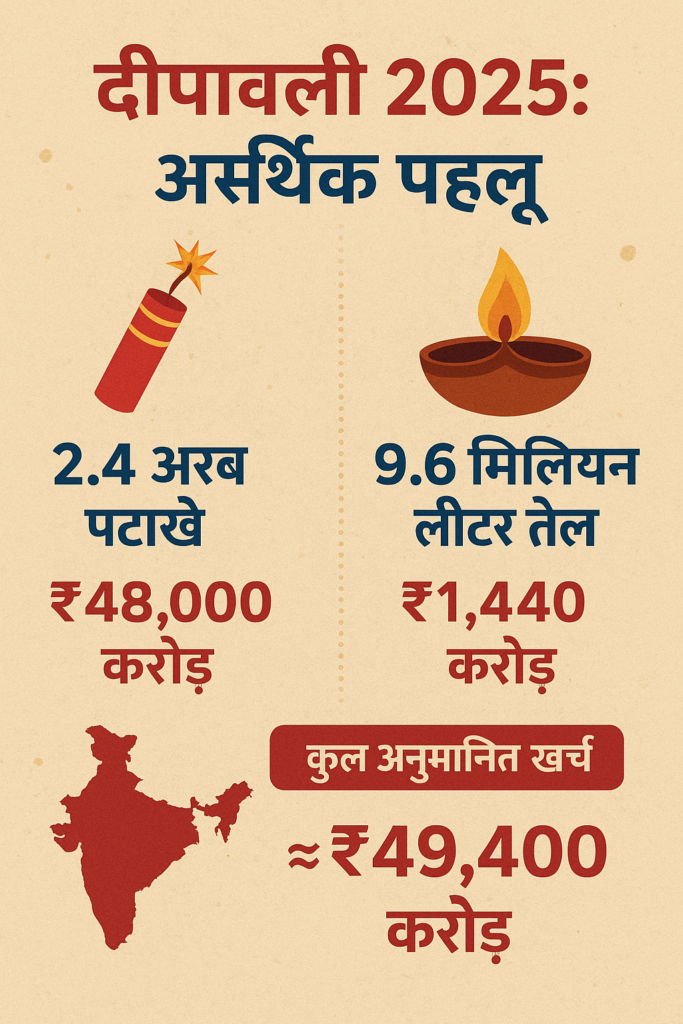 हरिद्वार,संजीव मेहता।देश दीपावली 2025 की तैयारी में डूबा है। इस बार “मनाई नहीं — मनाई जाएगी”, वो भी ऐसी रौनक के साथ कि आसमान से लेकर धरती तक उजाला बिखर जाएगा। विशेषज्ञों के अनुमान के मुताबिक इस साल भारत में करीब 2.4 अरब पटाखे छोड़े जाएंगे और लगभग 1 करोड़ लीटर तेल दीयों में जलेगा। 🌟 रात आसमान से बातें करेगी देशभर के महानगरों और कस्बों में आसमान रंगों से नहा जाएगा। दिल्ली, मुंबई, जयपुर, लखनऊ, देहरादून, पटना — हर जगह आतिशबाज़ी की चमक से रातें रौशन होंगी।क़रीब 20 से 25 हज़ार टन पटाखों के जलने का अनुमान है, जिससे 2 अरब से ज़्यादा धमाके आसमान में गूंजेंगे। 🪔 हर घर में दीप, हर दिल में उम्मीद देश के लगभग 12 करोड़ घरों में दीपक जलेंगे। औसतन 8–10 दीपक प्रति घर के हिसाब से करीब 9.6 मिलियन लीटर तेल या घी की खपत होगी।घरों में पारंपरिक सरसों, तिल और घी के दीपक इस बार भी शुभता, समृद्धि और प्रकाश का प्रतीक बनेंगे। “दीप केवल रोशनी नहीं देते, वे विश्वास की लौ जगाते हैं” — एक श्रद्धालु 🌿 हर रोशनी के साथ जागरूकता की लौ त्योहार के उल्लास के बीच पर्यावरण की चिंता भी बनी हुई है।कई राज्यों ने इस बार “ग्रीन क्रैकर्स” के प्रयोग की अपील की है। इनसे प्रदूषण 30–40% तक कम होता है।दिल्ली, मुंबई और लखनऊ में विशेष निगरानी टीमें बनाई गई हैं ताकि त्योहार की खुशी, प्रकृति की सेहत पर भारी न पड़े। 🕉️ आस्था और आधुनिकता का संगम दीपावली केवल रोशनी का नहीं, बल्कि अंधकार पर प्रकाश की विजय का पर्व है।पूरे देश में घरों की सजावट, लक्ष्मी–गणेश की पूजा, मिठाइयों की खुशबू और पारिवारिक मिलन इस पर्व को उत्सव से बढ़कर एक भावनात्मक अनुभव बना देते हैं। 💥 1️⃣ आतिशबाज़ी (Firecrackers) 🔸 अनुमानित आँकड़ा: कुल पटाखे: 2.4 अरब (2,400,000,000 pieces) कुल वजन: लगभग 24,000 टन औसत बाजार मूल्य: छोटे पटाखे (फुलझड़ी, अनार, चकरी आदि) ₹5–₹25 प्रति पीस बड़े पटाखे (रॉकेट, बम, शो पैक) ₹50–₹200 प्रति पीस औसत कीमत मान लें ₹20 प्रति पटाखा (सभी प्रकारों का मिश्रण) 🔹 कुल लागत: 2.4 अरब × ₹20 = ₹48,000 करोड़ रुपये 🪔 2️⃣ दीपक तेल / घी (Oil for Diyas) 🔸 अनुमानित आँकड़ा: कुल तेल खपत: 9.6 मिलियन लीटर यानी = 96 लाख लीटर प्रकार और औसत दाम: सरसों का तेल: ₹120 प्रति लीटर तिल का तेल / घी (प्रतीकात्मक रूप से): ₹180–₹200 प्रति लीटर औसत मिश्रित दर मान लें ₹150 प्रति लीटर 🔹 कुल लागत: 9.6 मिलियन × ₹150 = ₹1,440 करोड़ रुपये 💰 कुल अनुमानित आर्थिक प्रभाव श्रेणी मात्रा औसत दर अनुमानित कुल मूल्य आतिशबाज़ी 2.4 अरब पीस ₹20 प्रति पीस ₹48,000 करोड़दीपक तेल / घी 9.6 मिलियन लीटर ₹150 प्रति लीटर ₹1,440 करोड़कुल अनुमानित खर्च — — ≈ ₹49,400 करोड़ रुपये ✨ निष्कर्ष: 🪔 दीपावली 2025 पर भारत में सिर्फ रोशनी ही नहीं,लगभग ₹50,000 करोड़ रुपये की अर्थव्यवस्था भी घूमेगी —जिसमें आतिशबाज़ी, तेल, सजावट, मिठाइयाँ, कपड़े और इलेक्ट्रॉनिक्