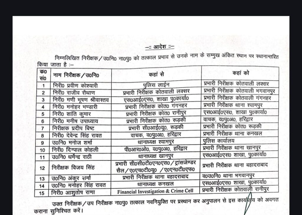 рд╣рд░рд┐рджреНрд╡рд╛рд░, рд╕рдВрдЬреАрд╡ рдореЗрд╣рддрд╛ред: рд╡рд░рд┐рд╖реНрда рдкреБрд▓рд┐рд╕ рдЕрдзреАрдХреНрд╖рдХ рдкреНрд░рдореЗрдВрджреНрд░ рдбреЛрдмрд╛рд▓ рдиреЗ рджреЗрд░ рд░рд╛рддреНрд░рд┐ рдЬрдирдкрдж рдореЗрдВ рдмрдбрд╝рд╛ рдкреНрд░рд╢рд╛рд╕рдирд┐рдХ рдлреЗрд░рдмрджрд▓ рдХрд░рддреЗ рд╣реБрдП рдирд┐рд░реАрдХреНрд╖рдХ рдПрд╡рдВ рдЙрдкрдирд┐рд░реАрдХреНрд╖рдХ рд╕реНрддрд░ рдХреЗ рдХреБрд▓ 15 рдЕрдзрд┐рдХрд╛рд░рд┐рдпреЛрдВ рдХреЗ рддрдмрд╛рджрд▓реЗ рдХрд░ рджрд┐рдП рд╣реИрдВредрдЬрд╛рд░реА рддрдмрд╛рджрд▓рд╛ рдЖрджреЗрд╢ рдХреЗ рдЕрдиреБрд╕рд╛рд░ рдкреБрд▓рд┐рд╕ рд▓рд╛рдЗрди, рд╡рд┐рднрд┐рдиреНрди рдХреЛрддрд╡рд╛рд▓реА, рдерд╛рдиреЛрдВ, рд╢рд╛рдЦрд╛рдУрдВ рдПрд╡рдВ рд╡рд┐рд╢реЗрд╖ рдЗрдХрд╛рдЗрдпреЛрдВ рдореЗрдВ рддреИрдирд╛рдд рдЕрдзрд┐рдХрд╛рд░рд┐рдпреЛрдВ рдХреЛ рдирдИ рдЬрд┐рдореНрдореЗрджрд╛рд░рд┐рдпрд╛рдВ рд╕реМрдВрдкреА рдЧрдИ рд╣реИрдВредрдкреБрд▓рд┐рд╕ рдкреНрд░рд╢рд╛рд╕рди рдХрд╛ рдХрд╣рдирд╛ рд╣реИ рдХрд┐ рдпрд╣ рдирд┐рд░реНрдгрдп рдХрд╛рдиреВрди рд╡реНрдпрд╡рд╕реНрдерд╛ рдХреЛ рдФрд░ рдЕрдзрд┐рдХ рдкреНрд░рднрд╛рд╡реА рддрдерд╛ рд╕реБрдЪрд╛рд░реБ рдмрдирд╛рдиреЗ рдХреЗ рдЙрджреНрджреЗрд╢реНрдп рд╕реЗ рд▓рд┐рдпрд╛ рдЧрдпрд╛ рд╣реИредЁЯСЙ рджреЗрдЦрд┐рдП рддрдмрд╛рджрд▓реЛрдВ рдХреА рдкреВрд░реА рд╕реВрдЪреАтАж Post Views: 133 ┬а Post navigation рдЧреНрд░рд╛рдореАрдгреЛрдВ рдХреА рд╕рдорд╕реНрдпрд╛ рдкрд░ рдЖрд╢реБ рдЪреМрдзрд░реА рд╕рдЦреНрдд, рдкрд░рд┐рдпреЛрдЬрдирд╛ рдирд┐рджреЗрд╢рдХ рд╡рд┐рд╢рд╛рд▓ рдЧреЛрдпрд▓ рд╕реЗ рд╕реАрдзреА рдмрд╛рддрдЪреАрдд UP рдкреБрд▓рд┐рд╕ рдкрд░ рд╣рдорд▓рд╛,рдмрд╛рдк рдХреЛ рдЫреБрдбрд╝рд╛рдиреЗ рдХреЗ рд▓рд┐рдП рдмреЗрдЯреЗ рдиреЗ рджрд┐рдЦрд╛рдИ рджрдмрдВрдЧрдИ, рд╕рд╛рдерд┐рдпреЛрдВ рд╕рдВрдЧ рдкреБрд▓рд┐рд╕ рд╡рд╛рд╣рди рдкрд░ рдХрд┐рдпрд╛ рд╣рдорд▓рд╛