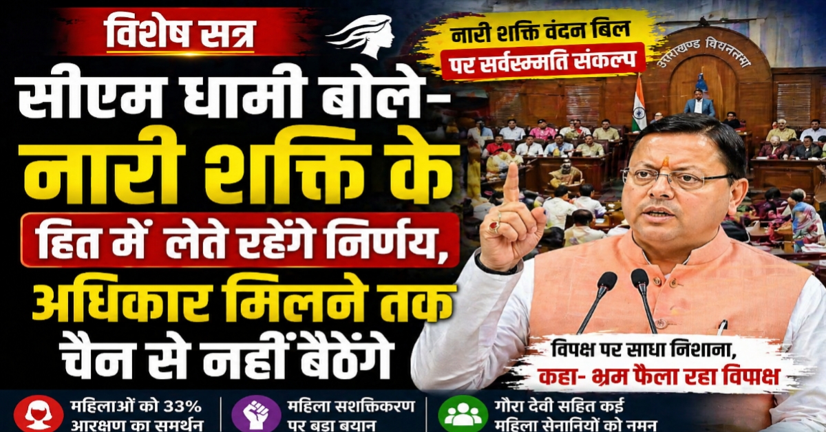 देहरादून, हरिद्वार संजीव मेहता।उत्तराखंड विधानसभा के विशेष सत्र में मुख्यमंत्री पुष्कर सिंह धामी ने कहा कि राज्य सरकार नारी शक्ति के हित में अब तक के सबसे बड़े और निर्णायक कदम उठा रही है। उन्होंने स्पष्ट कहा कि “जब तक महिलाओं को पूरा अधिकार नहीं मिल जाता, हम चैन से नहीं बैठेंगे।”💠 नारी शक्ति वंदन बिल पर सर्वसम्मति का प्रस्तावसीएम धामी ने संसद और विधानसभाओं में महिलाओं को 33% आरक्षण देने वाले नारी शक्ति वंदन बिल को जल्द लागू करने हेतु केंद्र सरकार के प्रयासों का समर्थन किया।उन्होंने इस विषय पर सर्वसम्मति संकल्प का प्रस्ताव भी सदन में रखा।💠 राज्य आंदोलन और महिला शक्ति का सम्मानसीएम धामी ने उत्तराखंड की महिला शक्ति का प्रतिनिधित्व करने वाली कई वीरांगनाओं को नमन किया, जिनमें शामिल हैं —गौरा देवी, टिंचरी माई, बिशनी देवी शाह, जशूली शौक्याण, कमला पंत, सरला बहन, हंसा धनाई आदि।💠 “सहभागिता से आगे… महिलाएं अब नेतृत्व में”सीएम ने कहा कि आज नारी शक्ति केवल सहभागिता तक सीमित नहीं है बल्कि—🚀 चंद्रयान मिशन🛡️ सेना और वायुसेना के अग्रिम मोर्चों🏆 खेलों में अंतरराष्ट्रीय उपलब्धियों—हर जगह महिलाएं नेतृत्व कर रही हैं।💠 2023 का ऐतिहासिक नारी शक्ति वंदन अधिनियमप्रधानमंत्री नरेंद्र मोदी द्वारा 2023 में लाया गया यह अधिनियम महिलाओं की नीति-निर्माण प्रक्रिया में भूमिका बढ़ाने की दिशा में युगांतकारी कदम बताया गया।इसमें लोकसभा और विधानसभाओं में 33% महिला आरक्षण का प्रावधान है।💠 विशेष सत्र में ऐतिहासिक अवसर खोया: विपक्ष पर हमलासीएम धामी ने कहा कि 16 अप्रैल को इस ऐतिहासिक संकल्प को साकार करने के लिए संसद का विशेष सत्र बुलाया गया, लेकिन विपक्ष ने इसे पास नहीं होने दिया।उन्होंने कहा कि“विपक्ष तालियां बजा रहा था, दृश्य देखकर महाभारत की वह घटना याद आ गई, जब द्रौपदी का अपमान हुआ था।”💠 “विपक्ष महिला आरक्षण पर भ्रम फैला रहा है”सीएम ने आरोप लगाया कि विपक्ष महिला आरक्षण जैसे गंभीर मुद्दे पर जनता को गुमराह कर रहा है।जबकि लोकसभा में गृहमंत्री अमित शाह पहले ही स्पष्ट कर चुके हैं कि किसी भी राज्य की सीटों के साथ कोई भेदभाव नहीं होगा।उन्होंने कहा कि“विपक्ष दशकों सत्ता में रहा, लेकिन महिलाओं को उनका अधिकार देने की हिम्मत कभी नहीं दिखाई।” Post Views: 1 Post navigation Earth Day पर हरिद्वार चमका! नन्दन कुमार और किरण जैसल का संयुक्त अभियान!