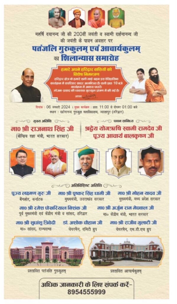 स्वामी जी महाराज ने कहा कि गुरुकुल ज्वालापुर की भूमि से एक नया इतिहास, नया कीर्तिमान रचा जाएगा। इस गुरुकुल का शिलान्यास देश के माननीय रक्षा मंत्री श्री राजनाथ सिंह करेंगे तथा इस भव्य कार्यक्रम में उत्तराखण्ड के यशस्वी माननीय मुख्यमंत्री श्री पुष्कर सिंह धामी, मध्य प्रदेश के यशस्वी मुख्यमंत्री श्री मोहन यादव, केन्द्रीय मंत्री श्री अर्जुन राम मेघवाल, राज्यसभा सांसद श्री सुधांशु त्रिवेदी, एमिटी ग्रुप के चेयरमैन डॉ. अशोक चौहान सहित आर्य समाज के लगभग सभी विद्वान, विभिन्न गणमान्य, भजनोपदेशक और संन्यासी महापुरुष, हरिद्वार के सभी पूज्य आचार्य महामण्डलेश्वर और संत महात्मा उपस्थित रहेंगे।